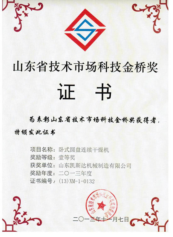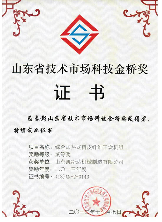 熱烈祝賀我公司研發的“臥式圓盤連續干燥機”和“綜合加熱式樹皮纖維干燥機組”,分別獲得“山東省技術市場金橋獎”一等獎和二等獎。