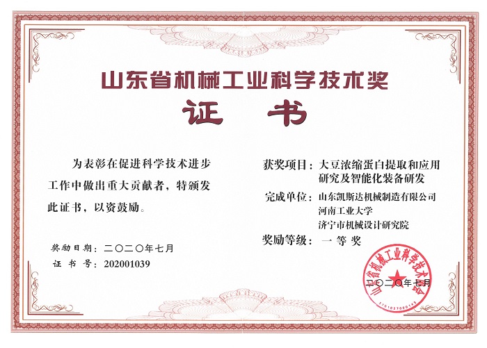 近日,2020年度山東省機械工業科技進步獎評審結果出爐,山東凱斯達機械制造有限公司與河南工業大學、濟寧市機械設計研究院聯合申報的“大豆濃縮蛋白提取和應用研究及智能化裝備研發”項目榮獲2020年山東省機械工業科技進步一等獎。