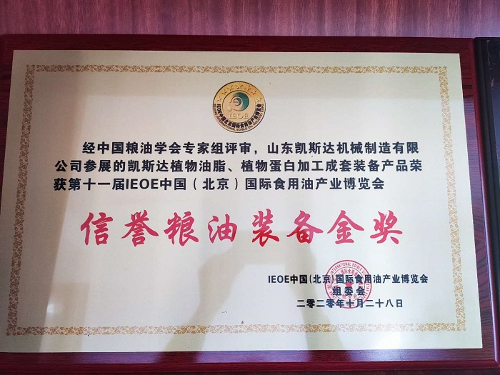 山東凱斯達機械制造有限公司榮獲第十一屆IEOE 中國(北京)國際食用油產業博覽會金獎