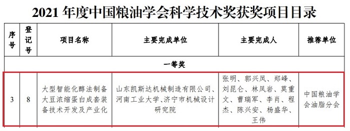 2021年11月10日,2021年度中國(guó)糧油學(xué)會(huì)科學(xué)技術(shù)獎(jiǎng)獲獎(jiǎng)項(xiàng)目名單公布,“大型智能化醇法制備大豆?jié)饪s蛋白成套裝備技術(shù)開(kāi)發(fā)及產(chǎn)業(yè)化”項(xiàng)目喜獲一等獎(jiǎng)。